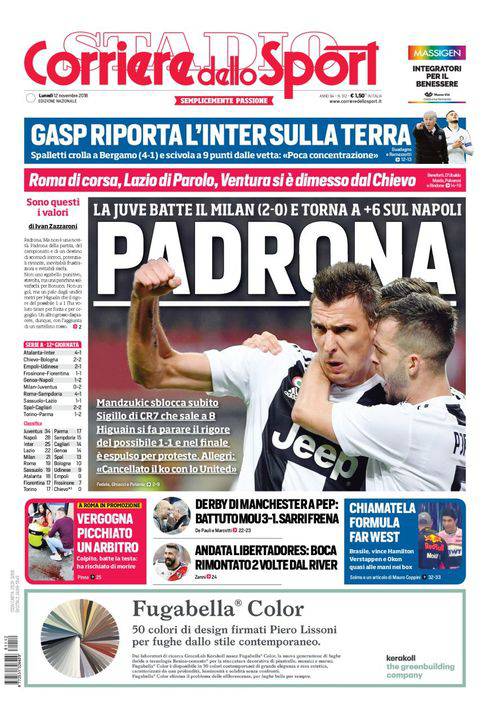 Corriere dello Sport – L’inter ritorna sulla terra grazie a Gasperini. L’Atalanta, infati, nel lunch-match domenicale ha battuto per 4 reti ad 1 la squadra di Spalletti, facendola scivolare al terzo posto dietro al Napoli. Fanno rumore le dimissioni di Ventura da allenatore del Chievo dopo poche settimane dall’assunzione dell’incarico. La Juventus è padrona. Mandzukic ha sbloccato subito il match contro il Milan e Cristiano Ronaldo ha messo il sigillo nel secondo tempo. Male Higuain: ha sbagliato un rigore e si è fatto espellere per proteste.