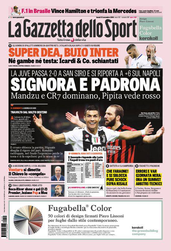 Gazzetta dello Sport – E’ super Dea e buio in casa Inter. Icardi e compagni schiantati da un’Atalanta in gran forma e con due terzi di difesa fuori uso. Signora e padrona la Juventus, che ha dominato il Milan grazie a Mandzukic e Cristiano Ronaldo. Il Pipita Higuain, invece, vede rosso e si fa espellere dopo aver sprecato la chance per il pari dal dischetto. Ventura si congela e il Chievo Verona lo ‘congela’.