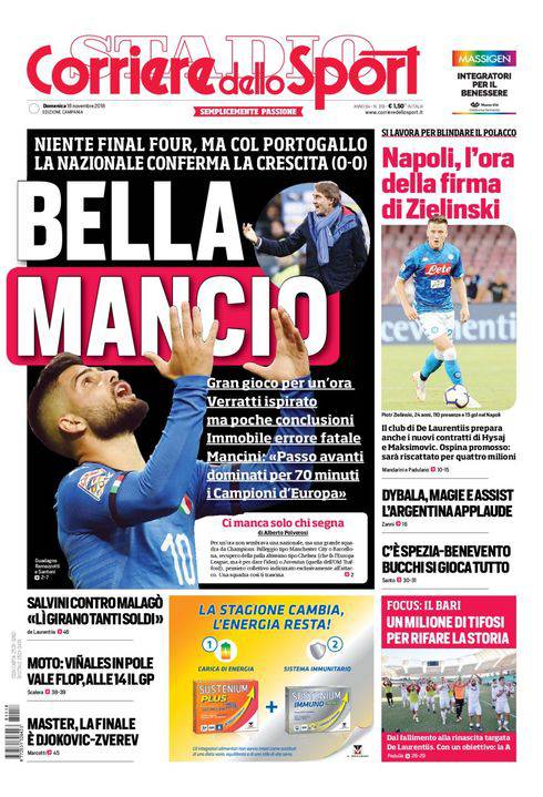 CORRIERE DELLO SPORT – Il giornale romano, nella sua edizione campana, parla di Italia-Portogallo. Prova positiva della Nazionale ma contro i lusitani è solo 0-0 e non basta per insidiare il primo posto, che va proprio agli avversari di ieri. Manca il gol agli azzurri, e su questo aspetto si dovrà lavorare. E per l’azzurro Napoli intanto Insigne rientra già oggi a Castel Volturno. C’è spazio anche per il rinnovo di Piotr Zielinski, poi i prossimi della lista saranno Hysaj e Maksimovic. Chiudono la prima pagina del CorSport altre notizie di calcio e vari sport.