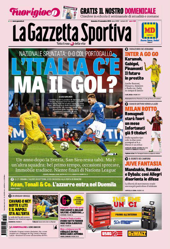 GAZZETTA DELLO SPORT – “L’Italia c’è, ma il gol?”. Finisce 0-0 Italia-Portogallo a San Siro, e ad un anno esatto dal match contro la Svezia che costò il Mondiale 2018 alla nazionale si è comunque assistito ad una risalita. Ma la strada da fare è molta. Milan, fuori Romagnoli per un mese. Si parla di altre notizie di calcio, tra le quali il duello tra compagni di squadra al PSG, Cavani e Neymar. L’uruguaiano compie un fallo sul brasiliano e sono scintille. Chiudono anche varie di altri sport.