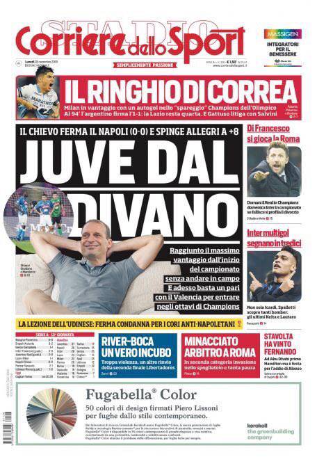 Corriere dello Sport – L’edizione odierna del quotidiano romano mette in primo piano l’allungo della Juventus sul Napoli fermato dal Chievo al San Paolo: “Juve dal divano. Il Chievo ferma il Napoli e spinge Allegri a +8. Raggiunto il massimo vantaggio dall’inizio del campionato senza andare in campo. E adesso basta un pari con il Valencia per entrare negli ottavi di Champions“.
