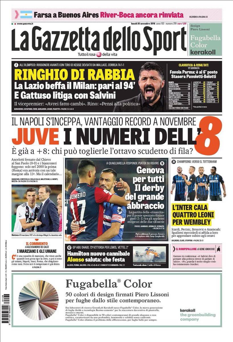 Gazzetta dello Sport – Il quotidiano sportivo italiano parla della tredicesima giornata di campionato che ha visto fermarsi il Napoli al San Paolo contro l’ultima in classifica: “Juve, i numeri dell’8. E’ già a +8: chi può toglierle l’ottavo scudetto di fila? Il Napoli s’inceppa, vantaggio record a novembre”.