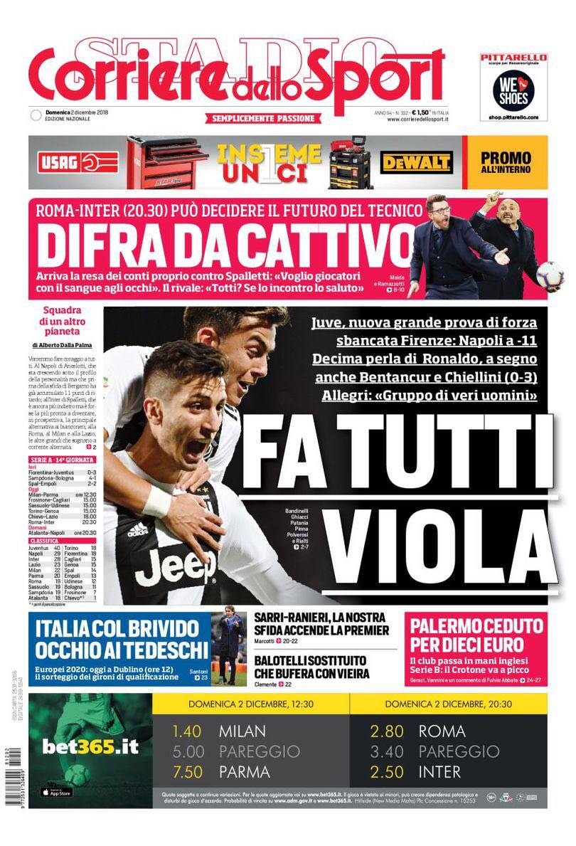Corriere dello Sport – L’edizione odierna del quotidiano romano mette in primo piano la forza della Juventus: “Fa tutti viola. Juve, nuova grande prova di forza. Sbancata Firenze: Napoli a -11. Decima perla di Ronaldo, a segno anche Bentancur e Chiellini (0-3)”. Il Napoli andrà di scena domani sera a Bergamo contro l’Atalanta: Ancelotti ha due dubbi di formazione.