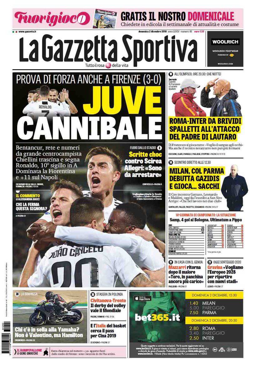 Gazzetta dello Sport – Anche l’edizione dell’altro quotidiano sportivo italiano mette in risalto la vittoria della Juventus a Firenze: “Juve cannibale. Prova di forza anche a Firenze (0-3)”.