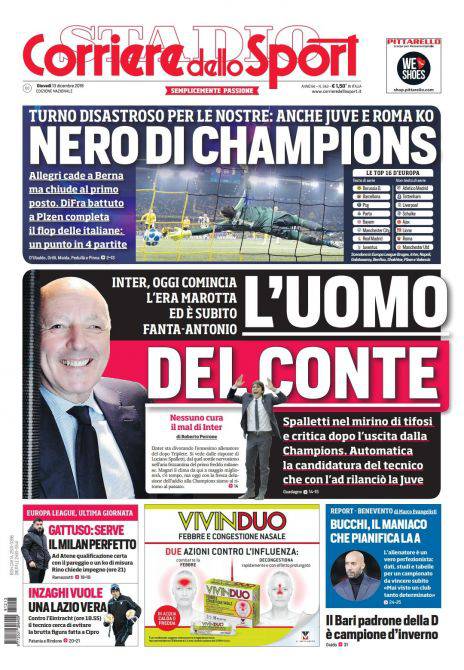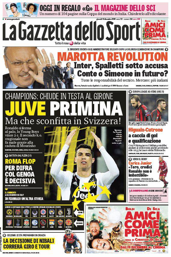 Juventus e Roma continueranno la loro avventura in Champions League nonostante le sconfitte di ieri sera. Come riportato dall’edizione odierna de “La Gazzetta dello Sport” Di Francesco rischia tanto: “Roma flop, per DiFra col Genoa è decisiva”. Risultato negativo anche per la squadra di Allegri: “Juve primina. Champions, chiude in testa al girone. Ronaldo si ferma al palo, lo Young Boys vince 2-1. Il secondo k.o. stagionale non fa male grazie alla caduta di Mourinho”. L’edizione de “Il Corriere dello Sport” parla anche dell’idea Antonio Conte per la panchina dell’Inter: “Oggi comincia l’era Marotta ed è subito Fanta-Antonio. L’uomo del Conte. Spalletti nel mirino di tifosi e critica dopo l’uscita dalla Champions”. Il Napoli, invece, pensa già all’Europa League con reali possibilità di arrivare fino in fondo alla competizione dopo un girone Champions entusiasmante.