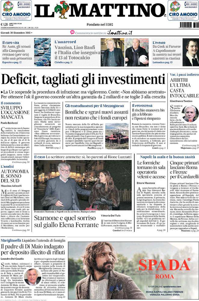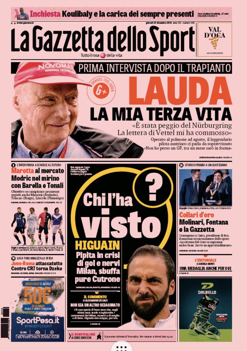 L’edizione de “Il Corriere dello Sport” mette in primo piano i numerosi intrecci di mercato: “Icardi si complica. Il rinnovo del contratto non esclude l’addio all’Inter. A gennaio nuovo incontro, la società alzerà l’offerta. Il nodo è la clausola, il club vuole eliminarla. Cavani gioca su due tavoli. Pensa a Napoli (‘Vorrei stare con i miei figli’), ma i milioni cinesi sembrano attrarlo di più”.