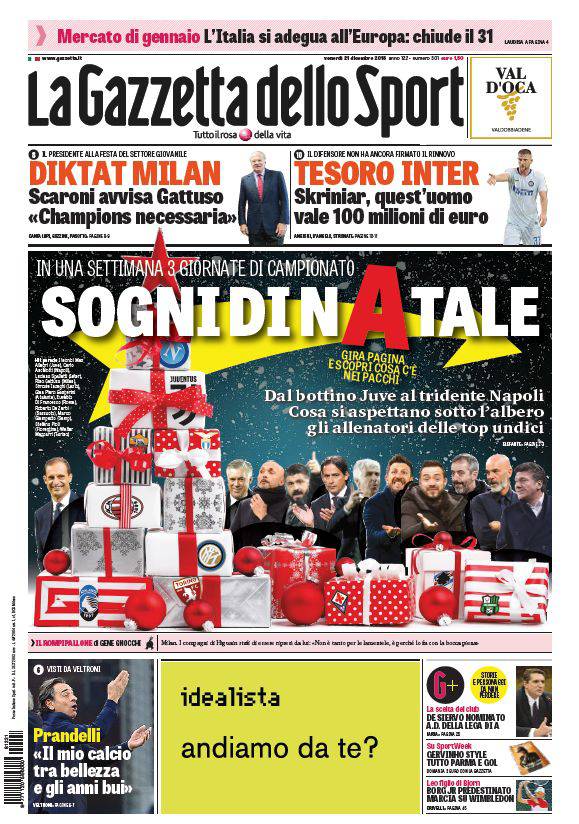 L’edizione odierna de “La Gazzetta dello Sport” mette in primo piano le prossime giornate di Serie A: “In una settimana tre partite di campionato. Dal bottino Juve al tridente del Napoli. Cosa si aspettano sotto l’albero gli allenatori delle top undici”.