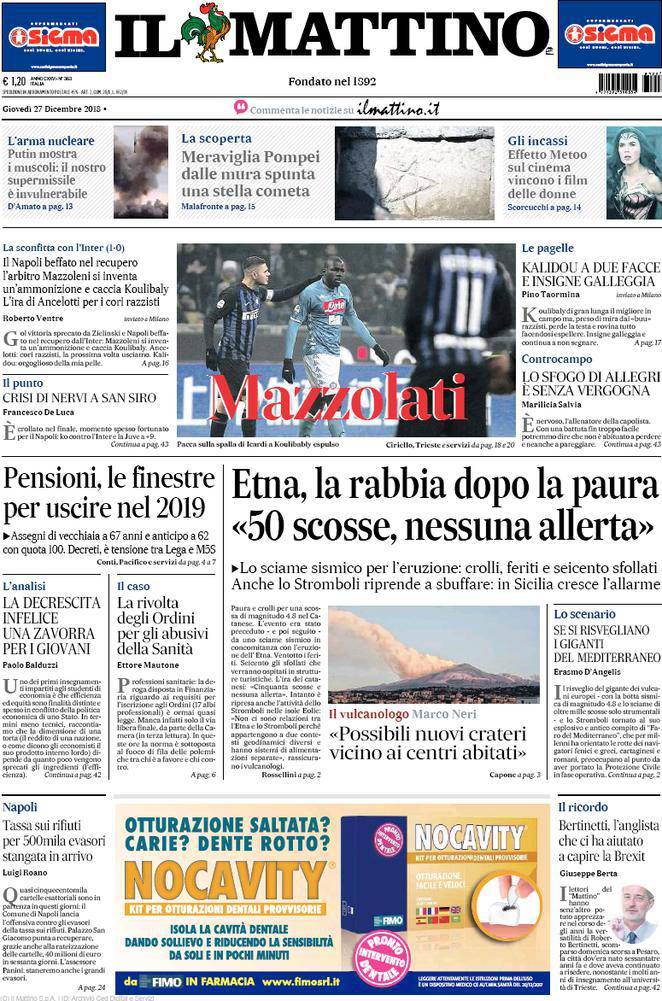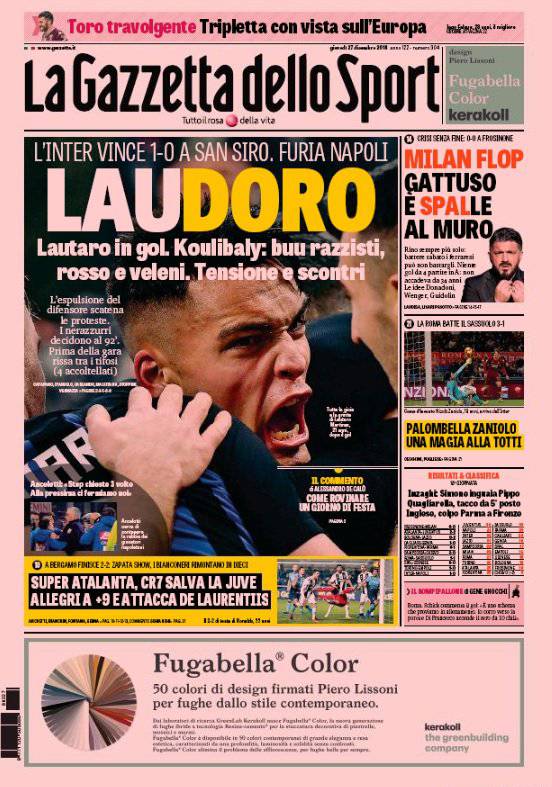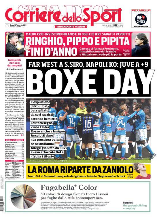 L’edizione odierna de “Il Corriere dello Sport” mette in primo piano l’episodio avvenuto ieri durante Inter-Napoli con protagonista Koulibaly: “Far West a San Siro. Napoli Ko: Juve a +9. Boxe Day. L’espulsione di Koulibaly bersagliato da cori razzisti accende la miccia. Lautaro segna, vince l’Inter. Ancelotti duro: ‘La prossima volta ce ne andiamo’”. Dello stesso avviso l’edizione de “La Gazzetta dello Sport”: ‘LaudORO, l’Inter vince 1-0 a San Siro. Furia Napoli. Koulibaly: buu razzisti, rosso e veleni. Tensione e scontri. L’espulsione del difensore scatena le proteste, i nerazzurri decidono al 92′. Prima della gara rissa tra tifosi (4 accoltellati)’.
