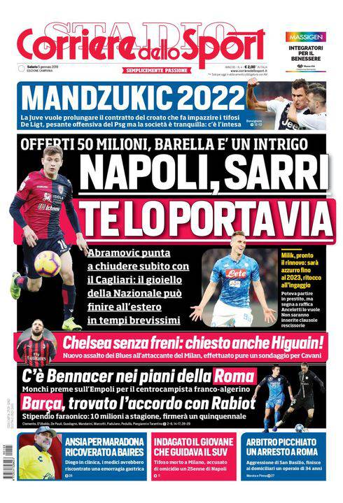 CORRIERE DELLO SPORT – La prima pagina del quotidiano romano nella sua edizione campana mette in primo piano l’offensiva del Chelsea per Nicolò Barella. Il talento del Cagliari è ambito dal Napoli già da tempo, ma ora anche Sarri starebbe puntando al ragazzo per poter assicurare al proprio organico energie nuove. Dall’Inghilterra proposti 50 milioni di euro contro i 20 più Rog ed Ounas offerti dal Napoli al Cagliari. Intanto è pronto il rinnovo di Milik, che dovrebbe firmare con aumento dell’ingaggio fino al 2023. In alto, anche Mandzukic prolunga con la Juve. Seguono altre notizie di mercato e vari sport.