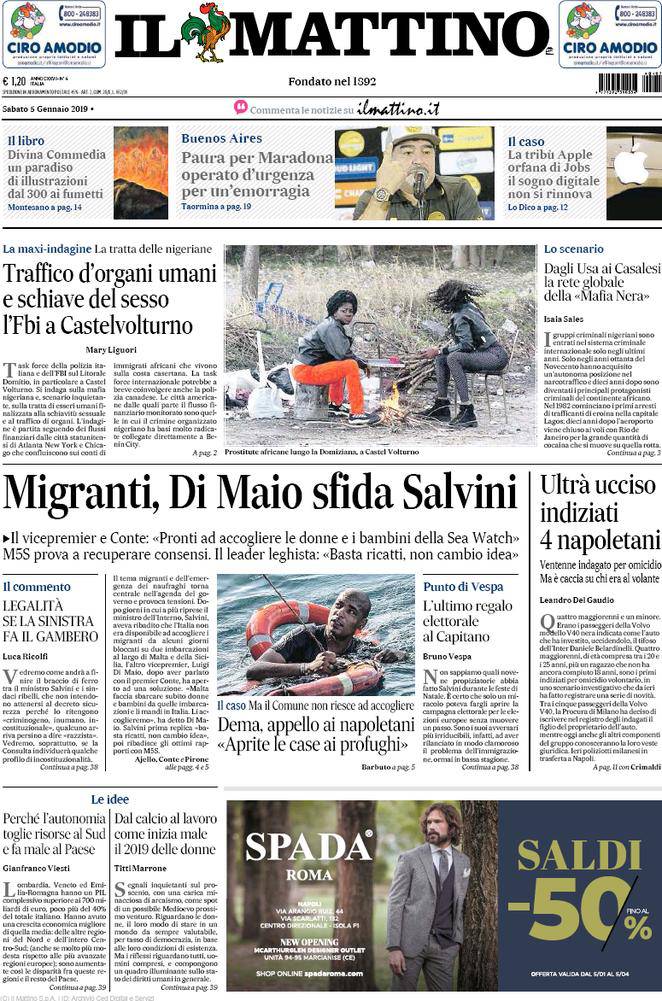 IL MATTINO – Il quotidiano napoletano presenta come sempre aggiornamenti di cronaca e di politica sia italiana che estera. Per quanto riguarda lo sport, si parla anche qui delle condizioni di Maradona e si ritorna sulla morte dell’ultra interista Daniele Belardinelli, per il quale ci sarebbero quattro tifosi del Napoli indagati.