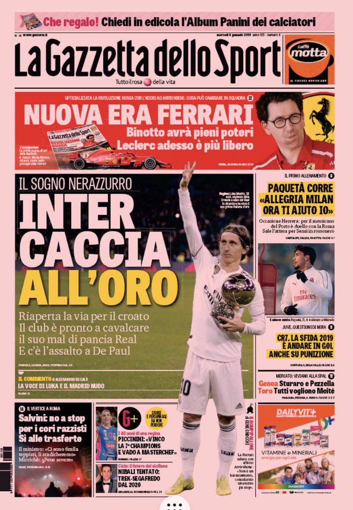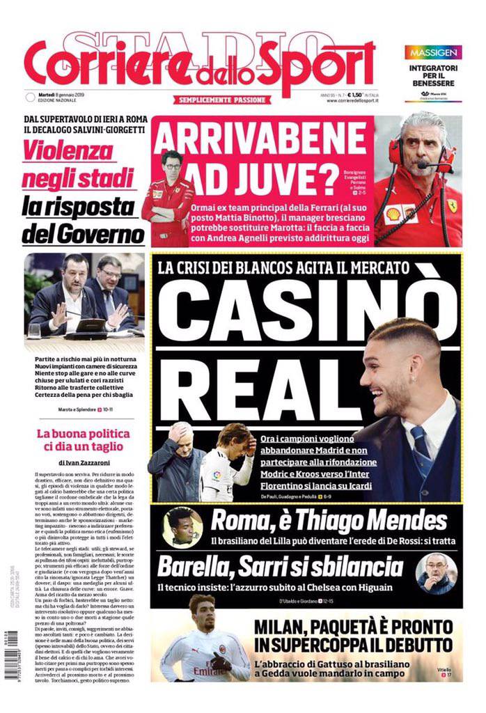Rassegna stampa 8 gennaio 2019: i principali titoli dei quotidiani sportivi nazionali.
