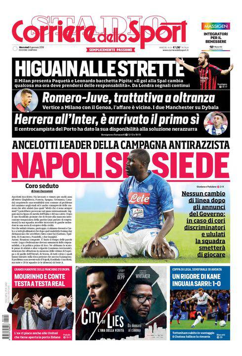 CORRIERE DELLO SPORT – L’edizione campana del quotidiano romano mette il Napoli e Koulibaly in prima pagina. In caso di cori razzisti la squadra azzurra si fermerà, altro che le parole del ministro dell’Interno Salvini, per il quale invece non si dovrebbe fare nulla. In alto, Higuain può ‘fuggire’ verso Londra in direzione Chelsea, dopo che al Milan cominciano a chiedergli di segnare di più. Juventus sul genoano Romero, mentre Dybala può andare via in direzione Manchester, da vedere se al City o allo United. Inter sull’ex obiettivo del Napoli Hector Herrera, a lungo inseguito nel 2016. In basso, Chelsea di Sarri battuto dal Tottenham nell’andata della Coppa di Lega. Per il Real Madrid panchina a Conte o di nuovo a Mourinho.