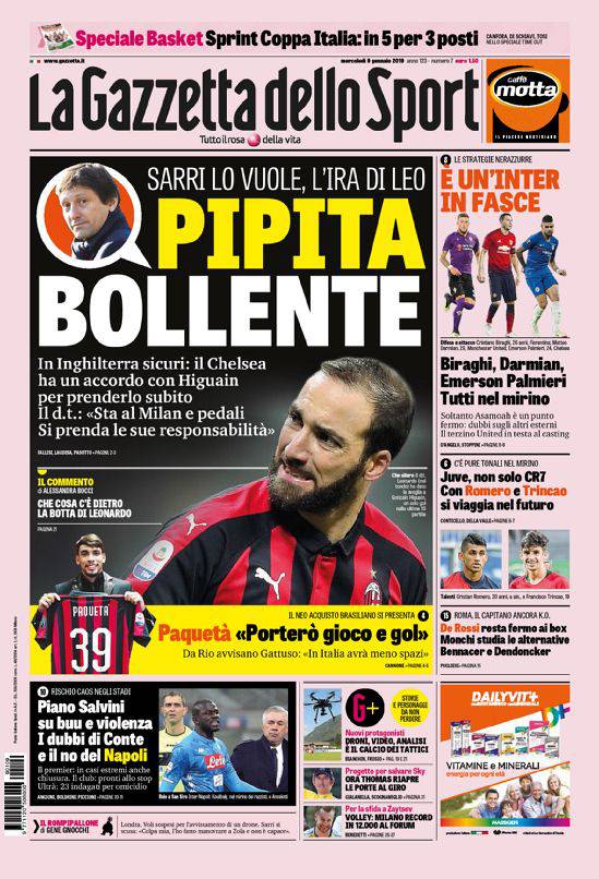 GAZZETTA DELLO SPORT – Il Milan presenta Paquetà, per Higuain l’addio a gennaio sembra essere una eventualità concreta. Il direttore tecnico Leonardo lo bacchetta: “Resta, deve assumersi le sue responsabilità”. A destra ci sono varie notizie di mercato, in basso si parla del razzismo nel calcio con i comportamenti da assumere che però dividono tutti. Chiudono altre notizie di calcio ed altro.
