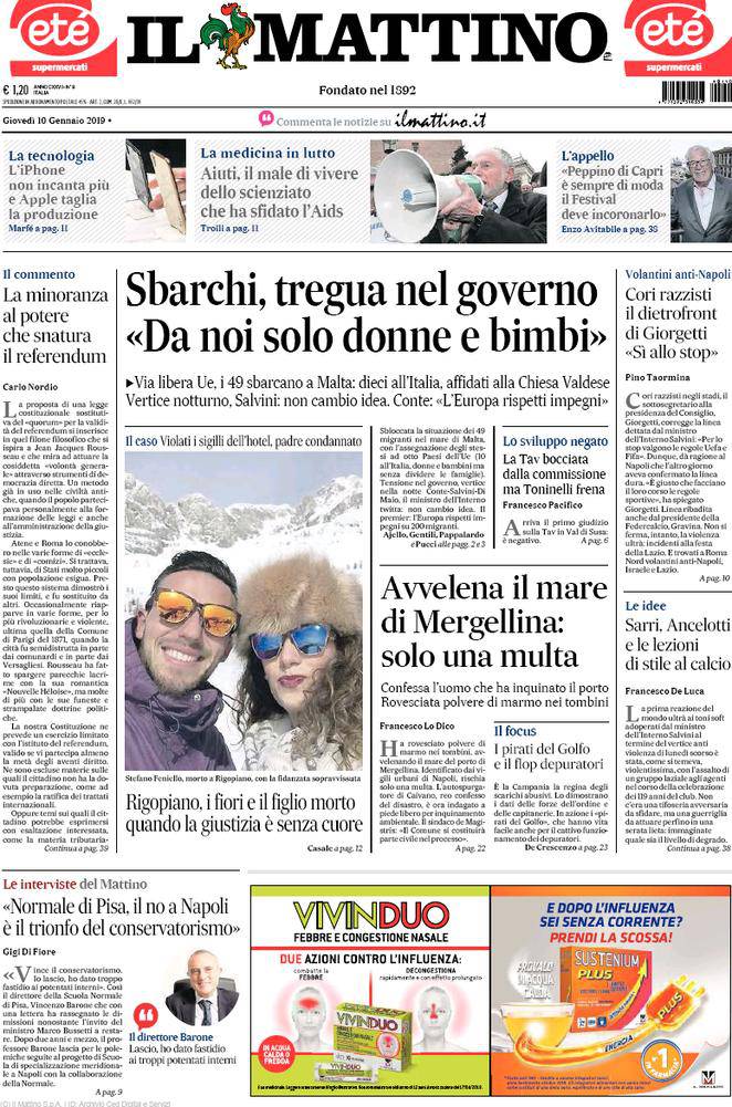 L’edizione odierna de “Il Corriere dello Sport” continua a mettere in primo piano la situazione per i cori razzisti: “Razzismo, stop alle gare. Ora il Governo fa dietrofront. Ha vinto Napoli. Giorgetti annuncia il cambio di linea. Gli ululati? Giusto che si applichino le regole sportive”. Continua l’assalto della società partenopea per il giovane centrocampista del Cagliari, Nicolò Barella, con o senza la cessione di Allan che piace al Paris Saint-Germain. L’edizione odierna de “La Gazzetta dello Sport”, invece, scrive di un’offerta importante per Allan da parte del PSG: “Napoli, 100 milioni del PSG per Allan. Così va su Barella“.