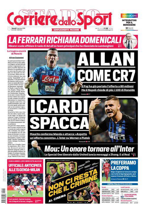 CORRIERE DELLO SPORT – Sull’edizione napoletana del quotidiano romano si parla di calciomercato. In casa Napoli tiene banco l’offerta del Paris Saint-Germain per Allan. Gli azzurri sparano altissimo per il brasiliano. Gli 80 mln di euro proposti dalla Francia non bastano, De Laurentiis ne vuole 100 per il suo mediano, “che vale quanto Cristiano Ronaldo”. Maretta in casa Inter con Mauro Icardi. L’attaccante argentino aspetta una proposta all’altezza e replica alle parole della moglie-agente, Wanda Nara, che aveva detto: “Con lo stesso ingaggio non vale la pena rinnovare il contratto”. In basso, Mourinho si ‘propone’ all’Inter ma anche al Real Madrid. Chiudono la prima pagina altre notizie di calcio.