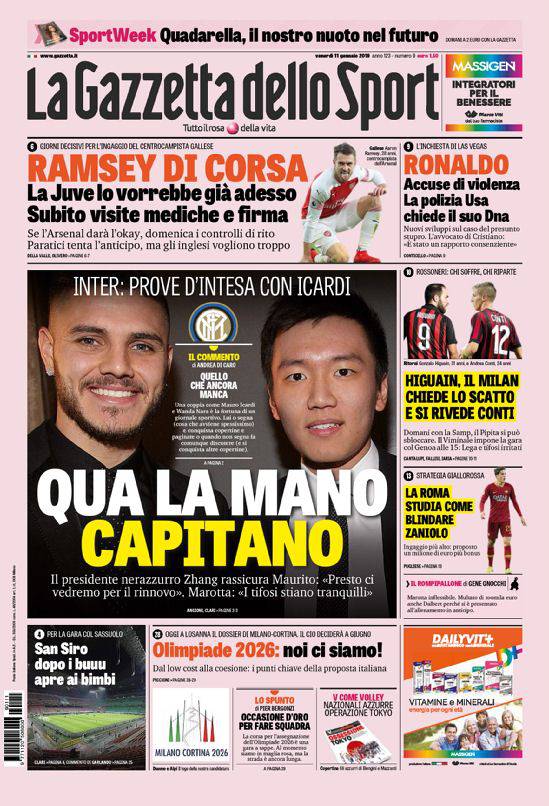 GAZZETTA DELLO SPORT – Il giornale milanese è spaventato dalle parole di Icardi (ed anche dalle critiche: ieri l’interista aveva aspramente polemizzato con la Gazzetta accusandola di scrivere falsità) e prova ad utilizzare dei titoli concilianti. Per la Juventus intanto c’è lo svincolato Ramsey dall’Arsenal, si cercherà di averlo per la Supercoppa Italiana contro il Milan. Cristiano Ronaldo intanto si becca una nuova accusa per presunto stupro da una sua ex fiamma. Non una parola sul calciomercato Napoli e su Allan. Chiudono altre notizie di calcio e vari sport.