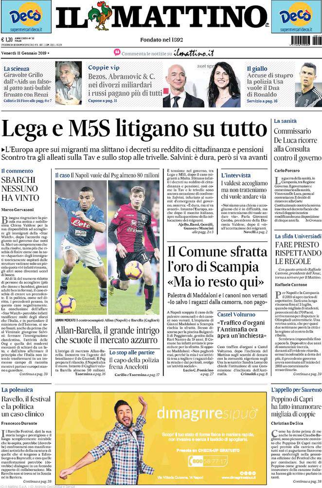 IL MATTINO – Sul giornale napoletano si parla di politica e cronaca sia italiane che estere. Per quanto riguarda il Napoli tiene banco il calciomercato. Con Allan via è pronto Barella, gli azzurri troverebbero immediata liquidità da investire subito in un sostituto. Ed il giovane mediano del Cagliari resta una prima scelta.