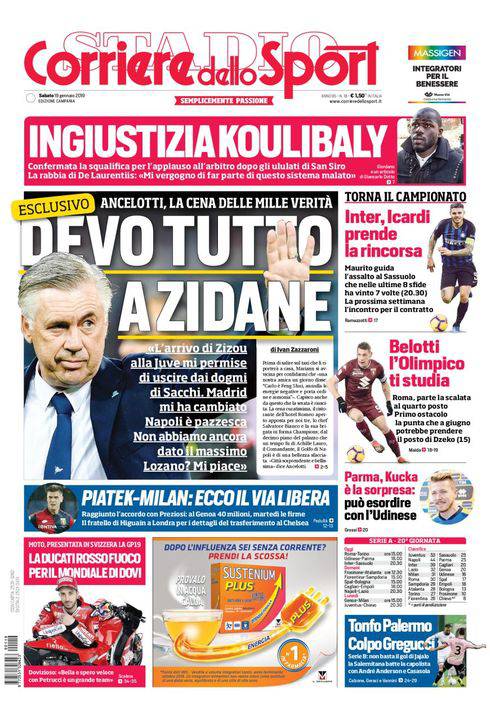 Per la rassegna stampa sportiva di oggi si parla del caso Koulibaly. Respinto il ricorso del Napoli contro la squalifica di due giornate del senegalese, niente riduzione. Salterà la Lazio. La cosa rende deluso ed arrabbiato De Laurentiis e si parla di ingiustizia. Parla al Corriere dello Sport Carlo Ancelotti, e non manca qualche retroscena sul Napoli. Stasera si gioca Inter-Sassuolo, al Meazza va in scena una bella iniziativa contro il razzismo nel calcio.