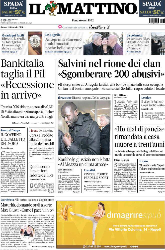Rassegna stampa sportiva di sabato 19 gennaio 2019, le prime pagine di CorSport, Gazzetta ed iI Mattino. Il caso Koulibaly fa discutere