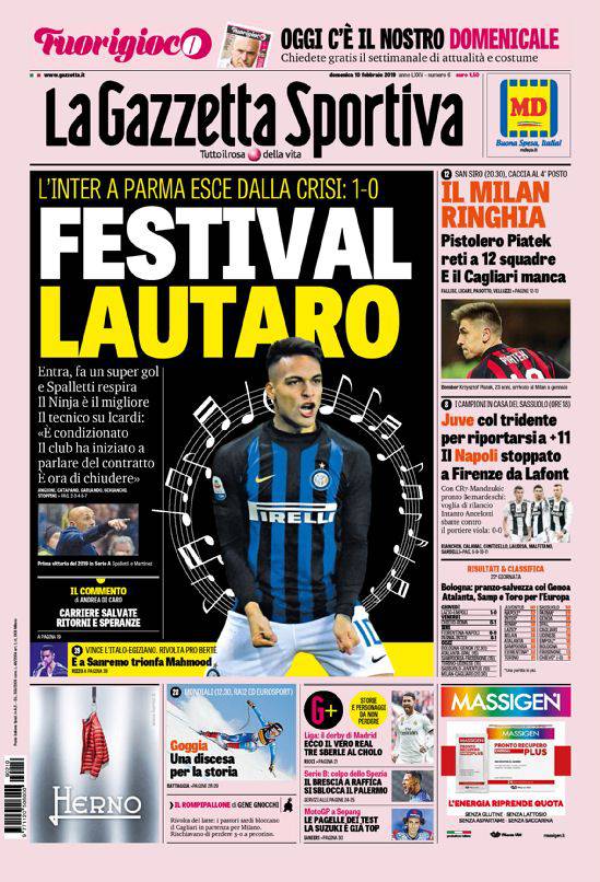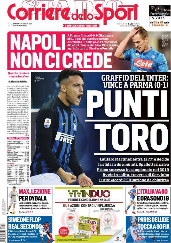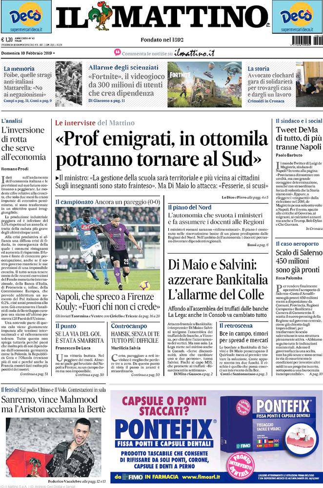Rassegna stampa sportiva di domenica 10 febbraio 2018. Le prime pagine: Fiorentina-Napoli da non credere.