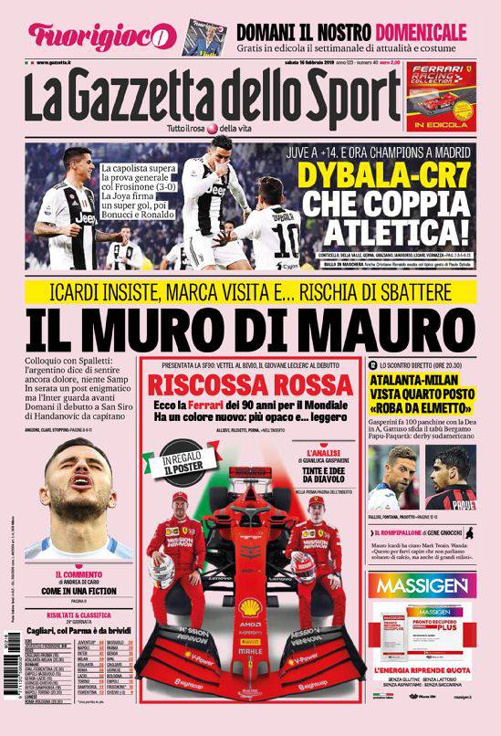 Rassegna stampa sportiva di sabato 16 febbraio 2019, le prime pagine di Corriere dello Sport, Gazzetta dello Sport ed Il Mattino. Vigilia di Napoli-Torino