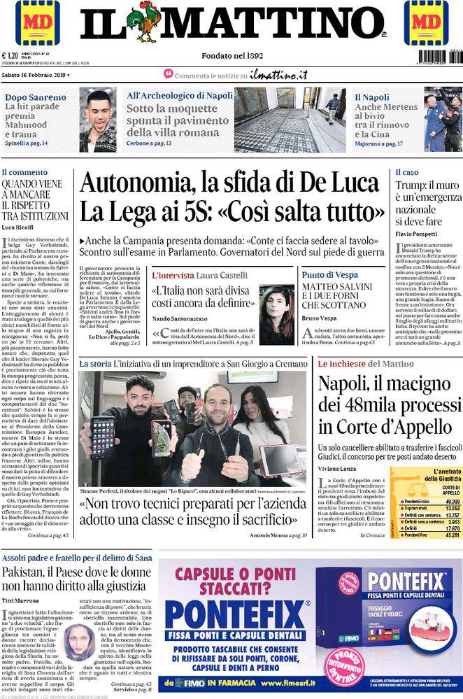 IL MATTINO – Il giornale napoletano parla come al solito di diverse news di politica e cronaca sia italiane che estere. Per quanto riguarda il calcio, domani c’è Napoli-Torino ma si parla di Mertens in chiave mercato: il belga va in scadenza nel 2020 e potrebbe salutare gli azzurri nella prossima estate.