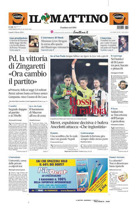 IL MATTINO – Ci va decisamente più duro il giornale napoletano con il titolo “Rossi di rabbia” indicando come “decisiva” l’espulsione di Meret. Inoltre il quotidiano partenopeo riporta anche il commento di Ancelotti che ritiene un’ingiustizia il risultato di ieri sera.