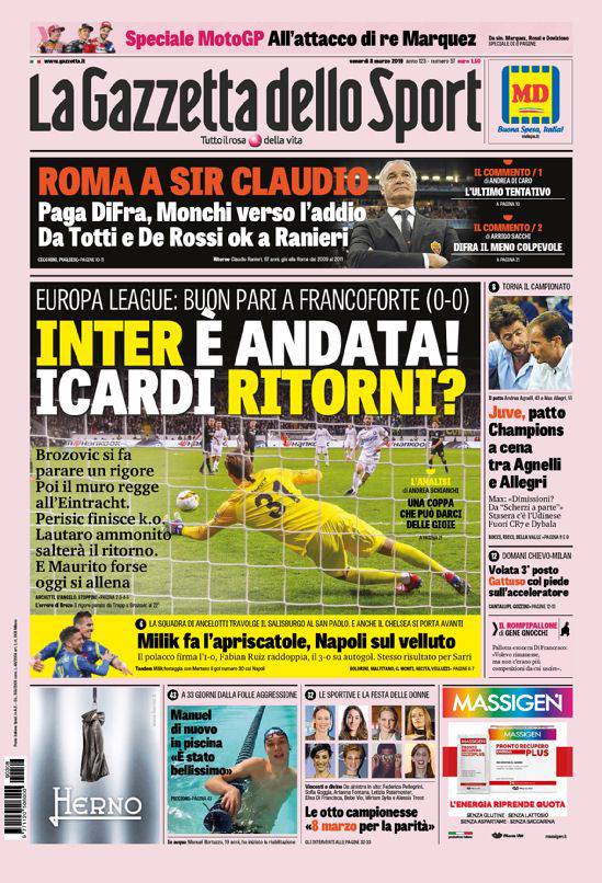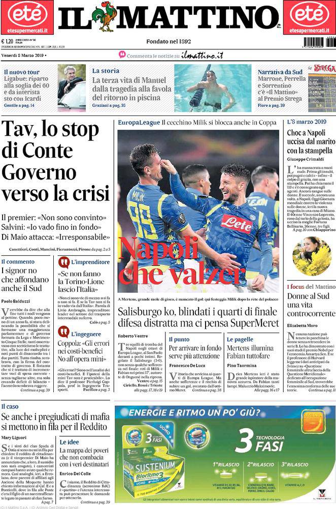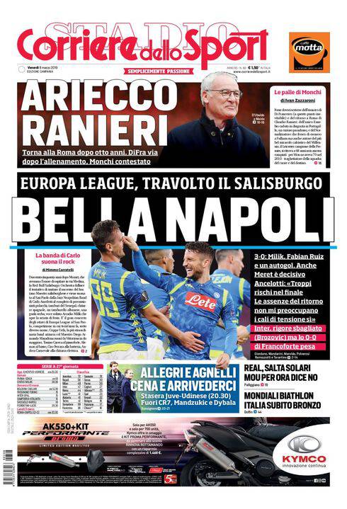 Rassegna stampa sportiva di venerdì 8 marzo 2019. Le prime pagine di CorSport, Gazzetta ed Il Mattino. Il Napoli supera con un rotondo 3-0 il Salisburgo, ora testa al campionato.