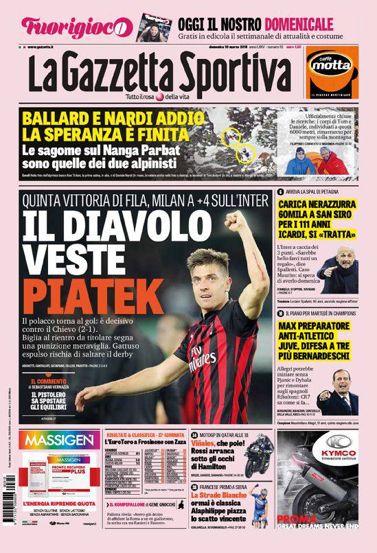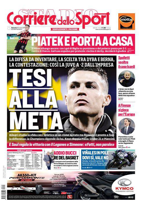 Rassegna stampa 10 marzo – Le prime pagine dei principali quotidiani sportivi letti in Campania aprono con un focus sul Milan che ha vinto, nell’anticipo del sabato, la gara di campionato contro il Chievo Verona, allungando momentaneamente sull’Inter. Decisivo ancora una volta il polacco Piatek. Si parla anche di Juventus, chiamata ad un’impresa contro l’Atletico allo Stadium. Ancora nel caos l’Inter, alle prese con il caso Icardi e la crisi in attacco. Oggi il Napoli, infine, proverà a battere il Sassuolo nella trasferta emiliana.