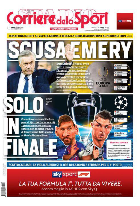 CORRIERE DELLO SPORT – Domani si gioca Napoli-Udinese per la 28/a giornata di campionato, ma la prima pagina dell’edizione campana del quotidiano romano è tutta incentrata sui sorteggi di coppe delle italiane. Il Napoli incontrerà l’Arsenal, la Juventus l’Ajax. Per gli azzurri è uno dei peggiori incroci possibili, ma anche da Londra non esultano. Ancelotti parla di “sfida affascinante”, e sarà un confronto con Emery all’insegna dei trionfi. ‘Carletto’ vanta 3 Champions League, lo spagnolo manager dei Gunners invece ha vinto altrettante Europa League di fila alla guida del Siviglia in passato. Insigne ko a Salisburgo, dovrebbe recuperare proprio per Arsenal-Napoli del prossimo 11 aprile. Possibile poi che gli azzurri incrocino il Chelsea di Sarri, Jorginho e Higuain in finale, se entrambe le squadre dovessero andare avanti. Per la Juve c’è l’Ajaxai quarti di Champions League, poi però ecco i rischi Manchester City in semifinale e Barcellona o Liverpool in finale.