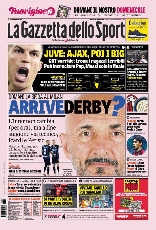 GAZZETTA DELLO SPORT – Anche sulla rosea si parla dei sorteggi di Champions ed Europa League. Il Napoli fa paura all’Arsenal. Intanto domani c’è il derby di Milano tra l’Inter ed i rossoneri. Si parla di addio annunciato di Luciano Spalletti alla panchina nerazzurra, dopo il caso Icardi e l’eliminazione dall’Europa League. Via anche l’argentino e Perisic. Chiudono la prima pagina altre notizie di calcio e vari sport.