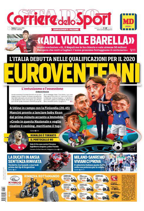 CORRIERE DELLO SPORT – La prima pagina del quotidiano romano è dedicata all’Italia. Questa sera c’è il debutto contro la Finlandia nelle qualificazioni ad Euro 2020, si gioca ad Udine. E mai come ora l’azzurro della nazionale si tinge di verde, con tanti giovani di qualità convocati dal ct Roberto Mancini. Manca solo Meret, ‘prestato’ all’Under 21. Il Portogallo fa 0-0 contro l’Ucraina, con Mario Rui e Cristiano Ronaldo in campo. In alto poi l’ammissione di Tommaso Giulini, presidente del Cagliari. “De Laurentiis vuole portare Barella al Napoli”. Chiudono la prima pagina altre notizie di calcio e vari sport.