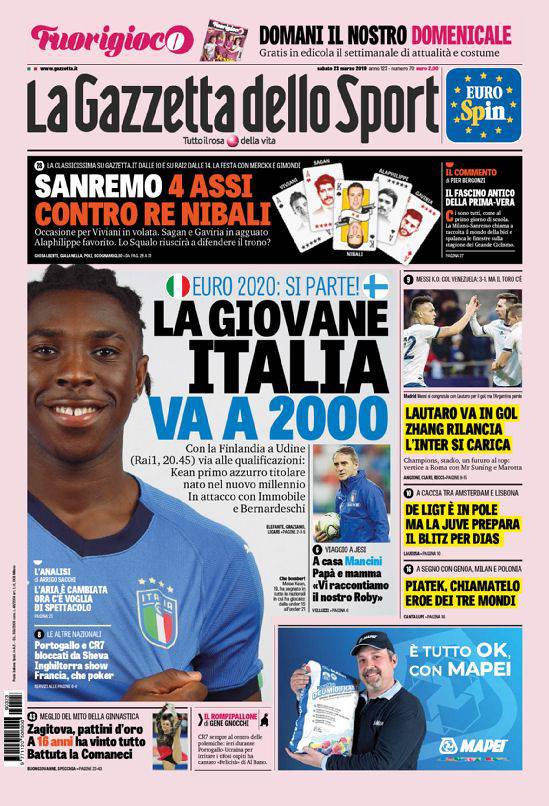 GAZZETTA DELLO SPORT – Il giornale milanese parla allo stesso modo della nazionale, con diversi classe 2000 tra i convocati di Mancini per Italia-Finlandia. Si parla di altre notizie di calcio a lato e della Milano-Sanremo di ciclismo in alto. Chiudono altri sport in basso.