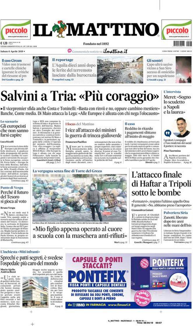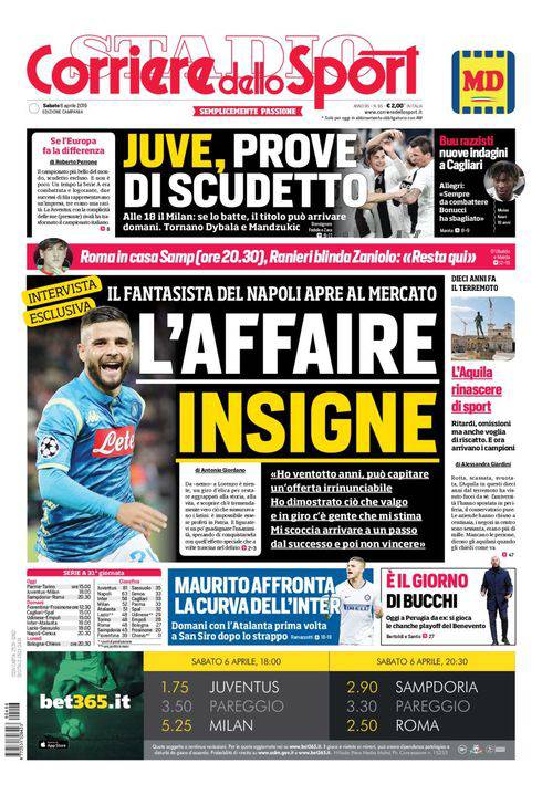 CORRIERE DELLO SPORT – Spiccano le parole di Lorenzo Insigne alla vigilia di Napoli-Genoa. “Mi stanco di fare sempre il secondo posto, voglio alzare dei trofei al cielo. Ho 28 anni, sono consapevole di quanto valgo e so che ci sono alcuni che mi stimano”. Intanto oggi si gioca Juventus-Milan e si indaga sull’odioso episodio di razzismo avvenuto nella trasferta di Cagliari. Poi in serata Roma-Sampdoria con Zaniolo che viene blindato a doppia mandata da Ranieri: “Non si muove da qui”. In basso Icardi torna a giocare a San Siro dopo oltre due mesi. Chiudono la prima pagina altre notizie di calcio oltre ad uno speciale sul terremoto de L’Aquila, che avvenne esattamente dieci anni fa.