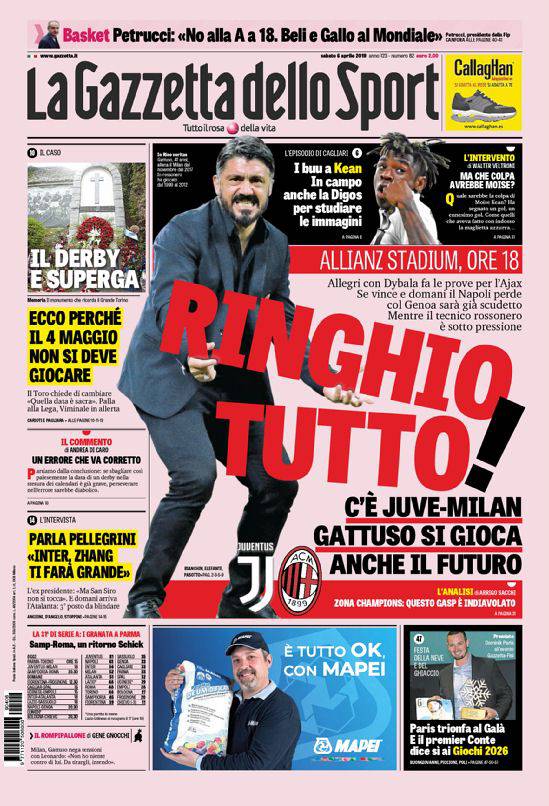 La Gazzetta non parla di Napoli-Genoa: “Il giorno di Juve-Milan”