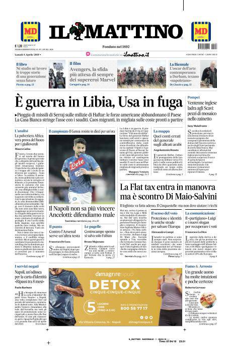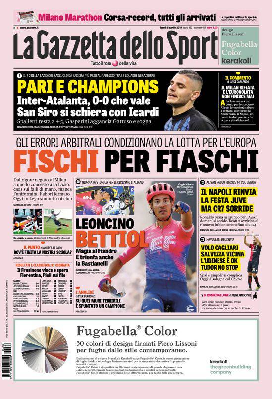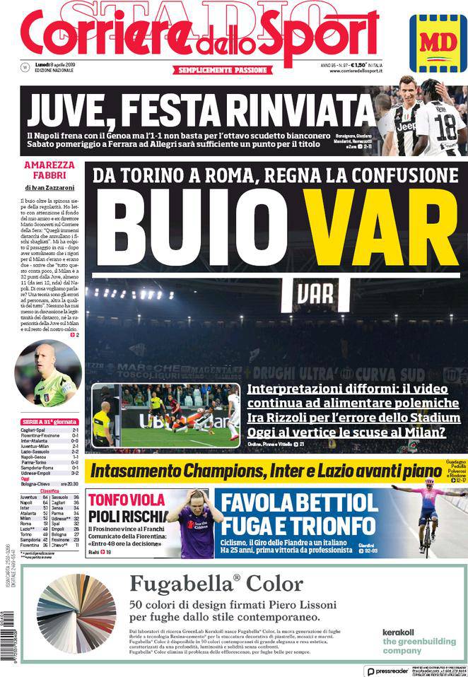 Rassegna stampa sportiva di lunedì 8 aprile 2019. Le prime pagine dei quotidiani sportivi. Il pareggio in Napoli-Genoa di ieri sera, la festa scudetto rinviata della Juventus e le condizioni degli azzurri in vista dell’Arsenal.
