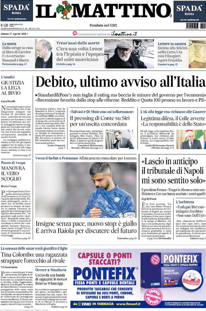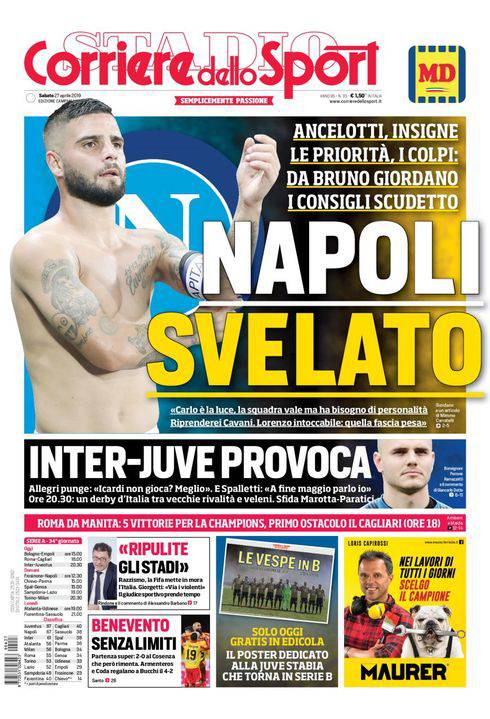 Rassegna stampa sportiva di sabato 27 aprile 2019, prime pagine di Corriere dello Sport, Gazzetta dello Sport ed Il Mattino. Insigne quasi out per Frosinone e l’avvenire è un rebus