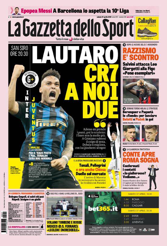 Rassegna stampa sportiva di sabato 27 aprile 2019, le prime pagine.