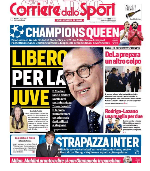 Si parla di Sarri Juve e dei passi in avanti compiuti in tal senso. Tutti i principali quotidiani sportivi italiani sono concentrati su questo argomento. Il manager del Chelsea avrebbe ricevuto un via libera preliminare per il suo approdo sulla panchina bianconera. E Sarri dovrebbe ricevere anche un indennizzo. Alla Juventus poi dovrebbe percepire 6 milioni all’anno per le prossime tre stagioni. Intanto De Laurentiis parla da Capri e promette: “Sarà il Napoli più forte di sempre, lunedì arriva una sorpresa”. Questa sera poi si gioca Tottenham-Liverpool, finale di Champions League. Riguardo al mercato del Napoli, i prossimi nomi nel mirino sono Rodrigo, punta del Valencia, e Lozano, attaccante esterno del PSV Eindhoven. Ed un altro nome caldo è Jordan Veretout della Fiorentina. L’Inter nel frattempo ha presentato Antonio Conte: “Sarà una squadra concreta e vincente”, promette il tecnico salentino. Per la panchina del Milan, rimasta vacante dopo le dimissioni di Gatuso, sarebbe pronto invece Marco Giampaolo.