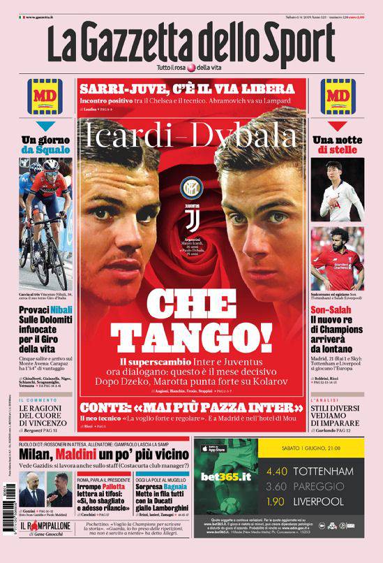 GAZZETTA DELLO SPORT – Non solo Sarri Juve, per il quale si parla di “via libera”. I bianconeri starebbero meditando con l’Inter lo scambio tutto argentino tra Icardi e Dybala. I nerazzurri intanto hanno nel mirino anche Dzeko, che il prossimo 30 giugno si svincolerà dalla Roma, ed il giallorosso Kolarov. Conte promette: “Mai più pazza Inter”. Questa sera occhio a Tottenham-Liverpool per la Champions League. Chiudono la prima pagina altre notizie di calcio e di altri sport.