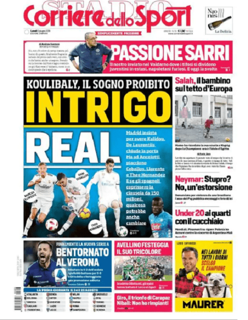 I quotidiani sportivi di oggi aprono con ancora l’argomento Sarri Juve in auge. Il tecnico vuole lasciare il Chelsea per sedere sulla panchina dei bianconeri. Ma il sodalizio inglese ora sembra meno propenso a lasciarlo andare via. Il Real Madrid intanto non smette di inseguire Koulibaly e resta presente, con il Napoli che al contempo segue tre elementi dei Galacticos. Si tratta dei giovani Theo Hernandez, Ceballos e Llorente. Koulibaly ha una clausola da 150 milioni di euro, come riferito dal Corriere dello Sport. Serie B, la finale Playoff Verona-Cittadella finisce 3-0, con un computo totale di 3-2. Gli scaligeri completano una grande rimonta e tornano in Serie A. In D invece l’Avellino vince lo scudetto. Chiudono altre notizie di calcio ed altri sport.