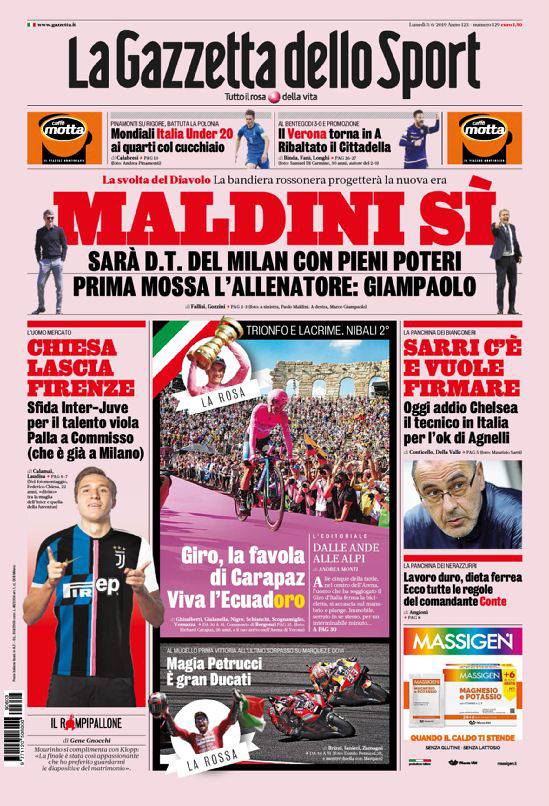 GAZZETTA DELLO SPORT – Il giornale milanese parla di Sarri Juve e della volontà dell’allenatore di voler andare nella Torino bianconera. Che potrebbe anche essere una delle destinazioni di Federico Chiesa. Il talento viola è conteso anche dall’Inter, ed è stato a lungo inseguito dal Napoli. Maldini resta al Milan, sarà direttore tecnico. Verona di nuovo in Serie A, l’Italia Under 20 ai Mondiali con un rigore a cucchiaio di Pinamonti. Chiudono notizie di calcio ed altri sport.
